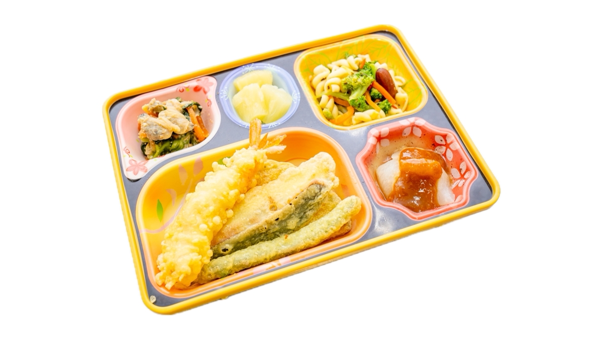 天ぷら盛り合わせ/大根の田楽/パスタサラダ/カットパイン/ あさりとほうれん草のごま味噌和え